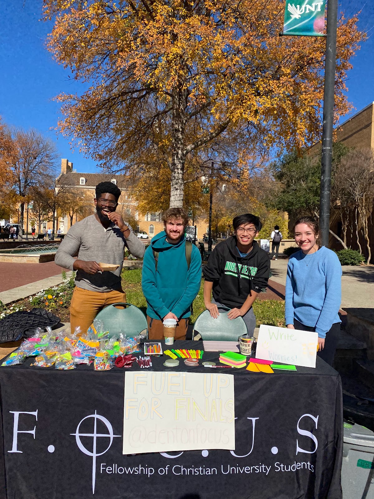 Cathryn the other apprentice with me (on the very right) and I planned an outreach event on campus for students to "Fuel up for Finals." We made goodie bags with snacks and wrote different verses to go inside each one as well as various study materials to take if they needed them. We had three students from this event who joined our small groups that same night and the following day and who wanted to consistently be connected. This was completely unexpected. Praise God!